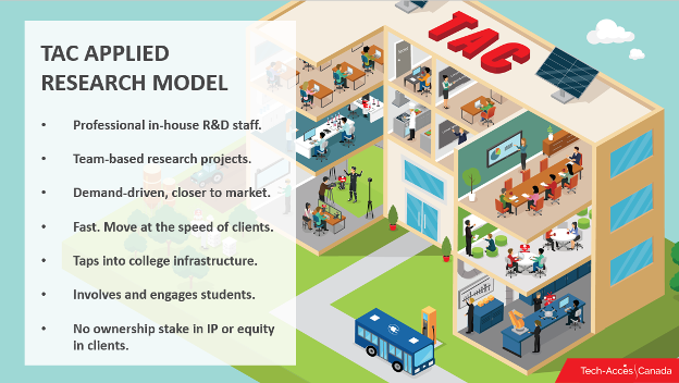 The TAC model was designed to de-risk novel research and innovation activity for small firms working toward commercialization. The TACs avoid undertaking any routine work that is already provided adequately by private industry and strive to avoid unintended competition with colleagues in the private sector.