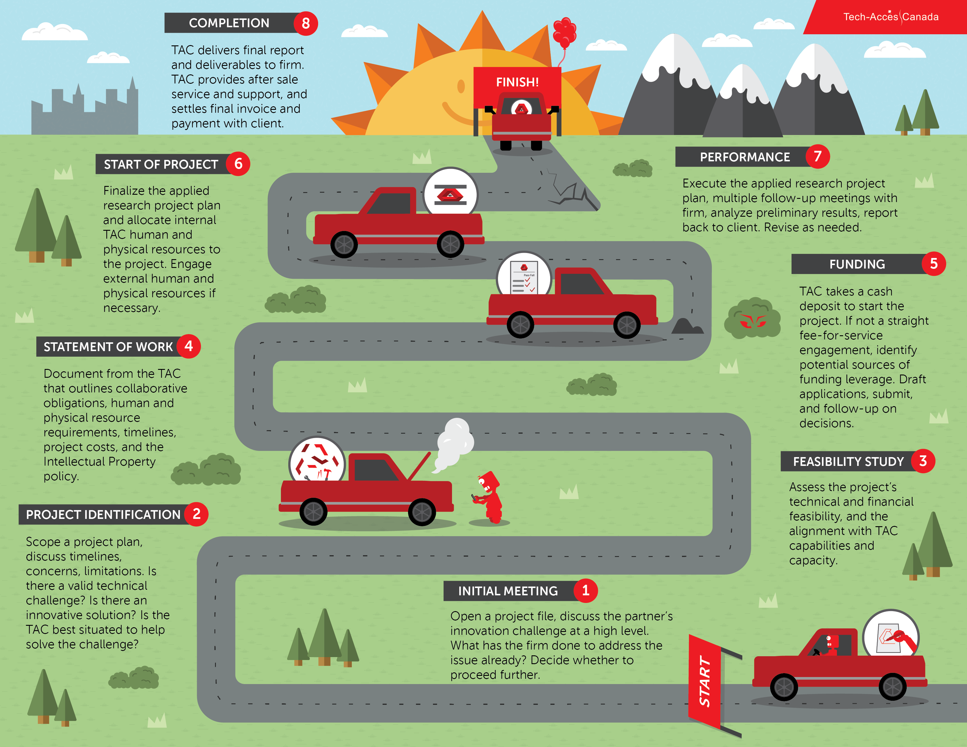 After making first contact with a member of a TAC team to discuss a technical challenge or R&D project, the TAC will scope a feasible project plan, develop a statement of work, identify potential sources of funding and deliver a completed project.