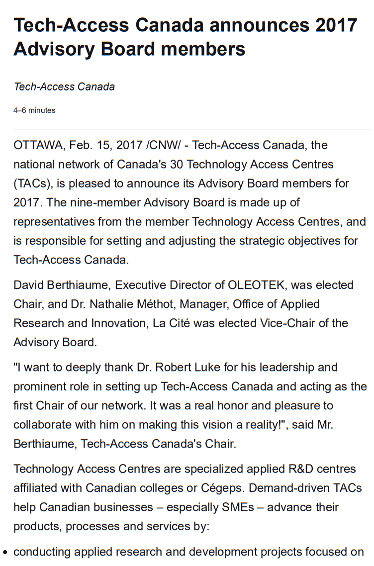 OTTAWA, Feb. 15, 2017 /CNW/ – Tech-Access Canada, the national network of Canada’s 30 Technology Access Centres (TACs), is pleased to announce its Advisory Board members for 2017. The nine-member Advisory Board is made up of representatives from the member Technology Access Centres, and is responsible for setting and adjusting the strategic objectives for Tech-Access Canada.
