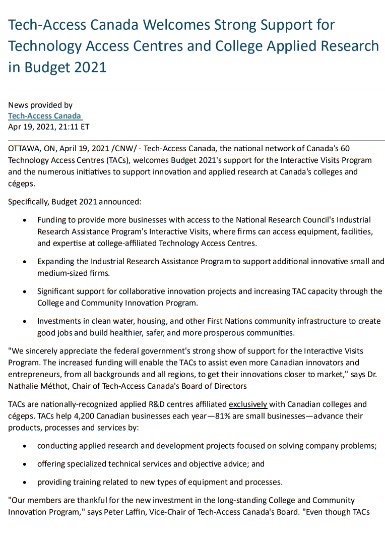 OTTAWA, ON, April 19, 2021 /CNW/ – Tech-Access Canada, the national network of Canada’s 60 Technology Access Centres (TACs), welcomes Budget 2021’s support for the Interactive Visits Program and the numerous initiatives to support innovation and applied research at Canada’s colleges and cégeps.