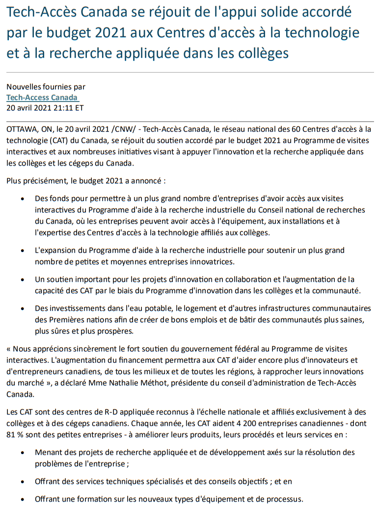 Tech-Accès Canada se réjouit de l’appui solide accordé par le budget 2021 aux Centres d’accès à la technologie et à la recherche appliquée dans les collèges