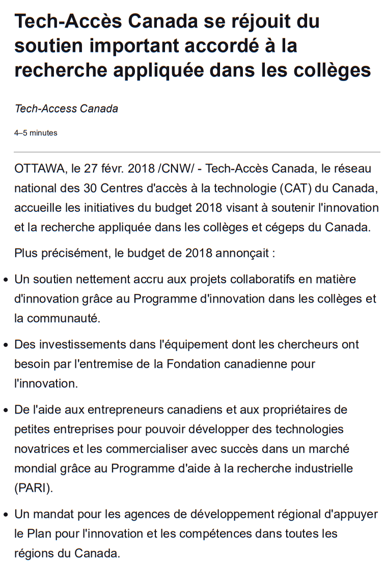 OTTAWA, le 27 févr. 2018 /CNW/ – Tech-Accès Canada, le réseau national des 30 Centres d’accès à la technologie (CAT) du Canada, accueille les initiatives du budget 2018 visant à soutenir l’innovation et la recherche appliquée dans les collèges et cégeps du Canada.
